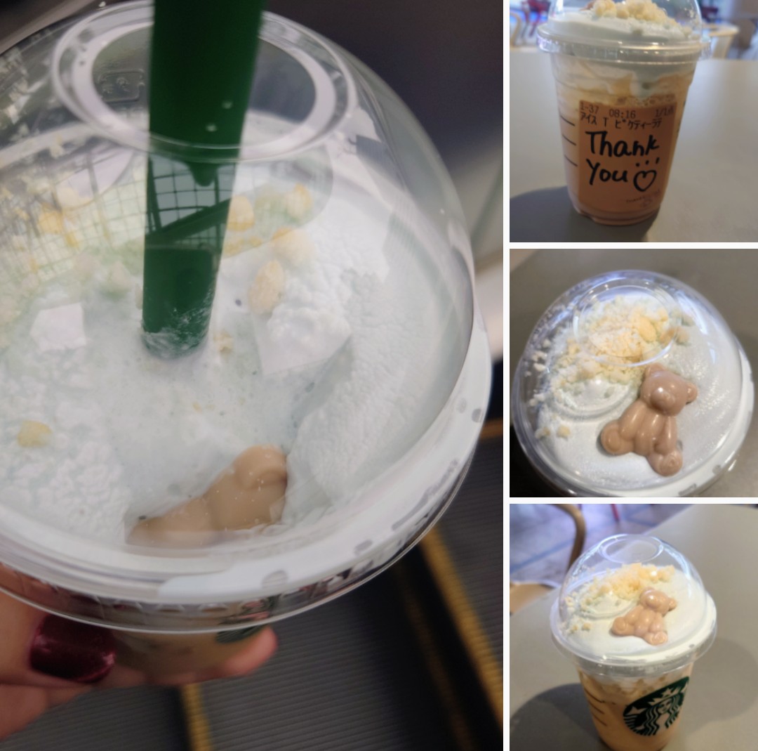 写真は10月に名古屋のスタバでジェラピケコラボのドリンクを頼んだ時に「初めてお飲みですか?」と聞かれてそうですと答えたら「クマがすぐ沈んじゃうので気を付けてください」と言われて、急いで写真を撮るも、本当にあっという間に見えなくなったなぁ・・・という思い出w